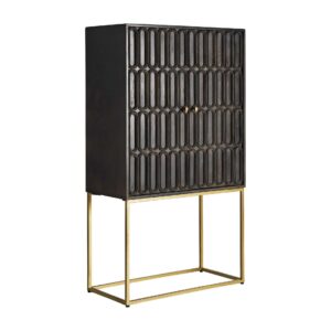 Más allá de su atractivo visual, el Armario Emly ha sido diseñado pensando en la utilidad. Su interior espacioso lo convierte en una solución versátil de almacenamiento: ideal para vajilla, libros, textiles, documentos o incluso como armario para bebidas. La estructura se alza sobre una base de latón, lo que permite una sensación de ligereza visual a pesar de su imponente presencia.