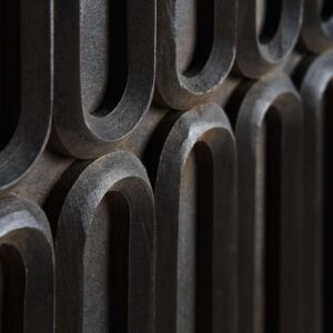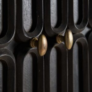 Desde el primer vistazo, el armario Emly capta la atención gracias a su espectacular diseño en relieve geométrico. Las formas alargadas y ovaladas que decoran la superficie de las puertas no son solo un guiño al art déco clásico, sino que también aportan profundidad, movimiento y textura al mueble. Este patrón esculpido en la madera no solo embellece, sino que también aporta a cada unidad una apariencia única y artesanal, lo que eleva su valor decorativo.