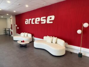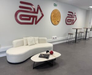 - Tonos corporativos (rojo y blanco) aplicados estratégicamente en mobiliario y decoración.