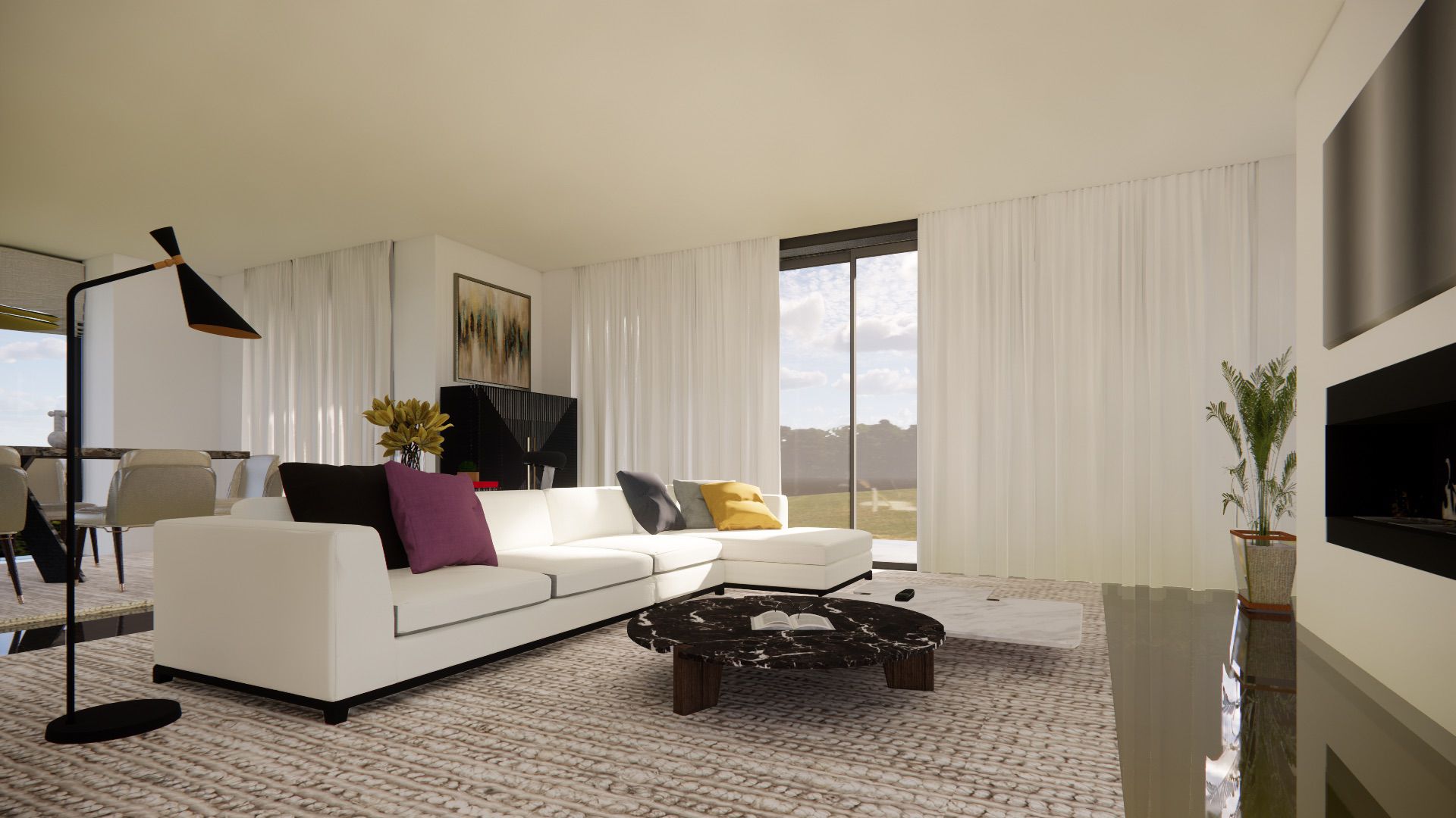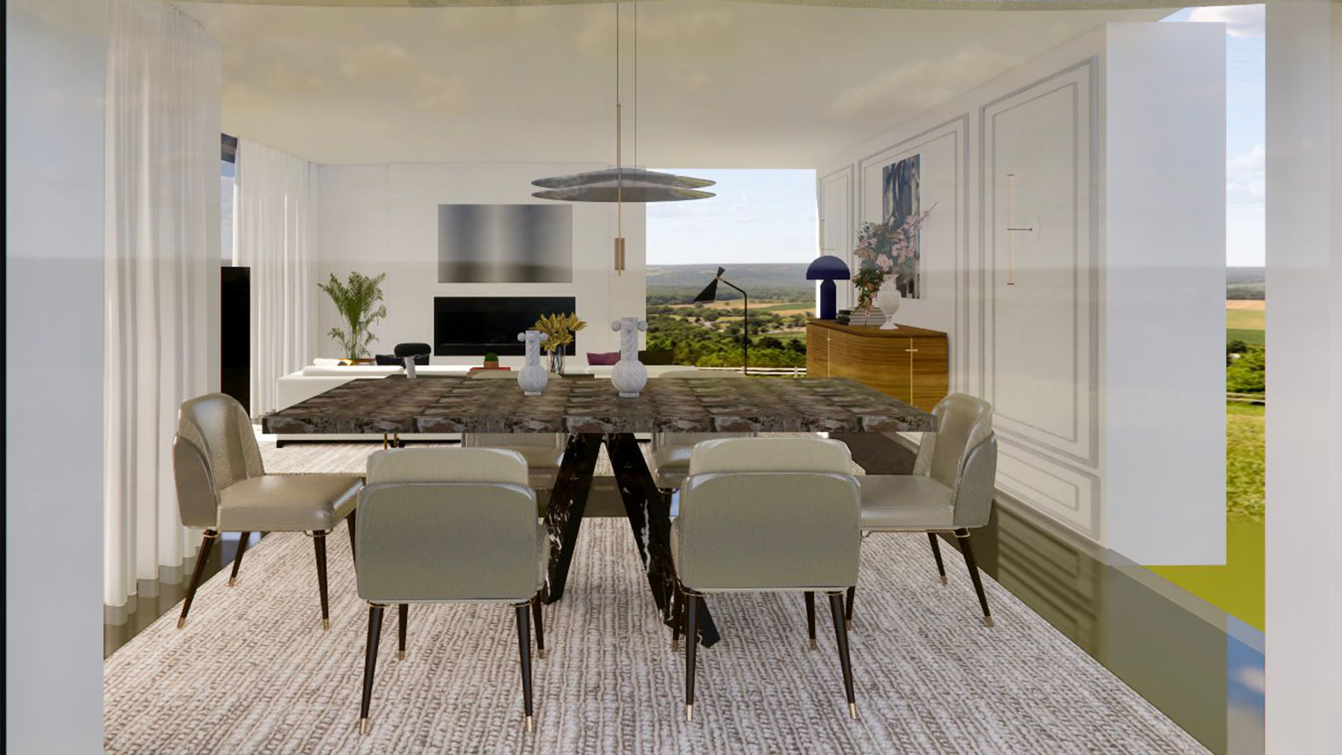 Se propone una zona de estar compuesta por dos sofás, tapizados con tela exterior, mesas de centro, dos espejos para dar profundidad y alfombra de exterior para enmarcar el ambiente. Zona de comedor, compuesta por un conjunto de mesa y seis sillas combinando tapicerías con la zona de estar. Se complementa el espacio con cojines de diferentes tonalidades, luminarias de sobremesa, faroles con velas y plantas.