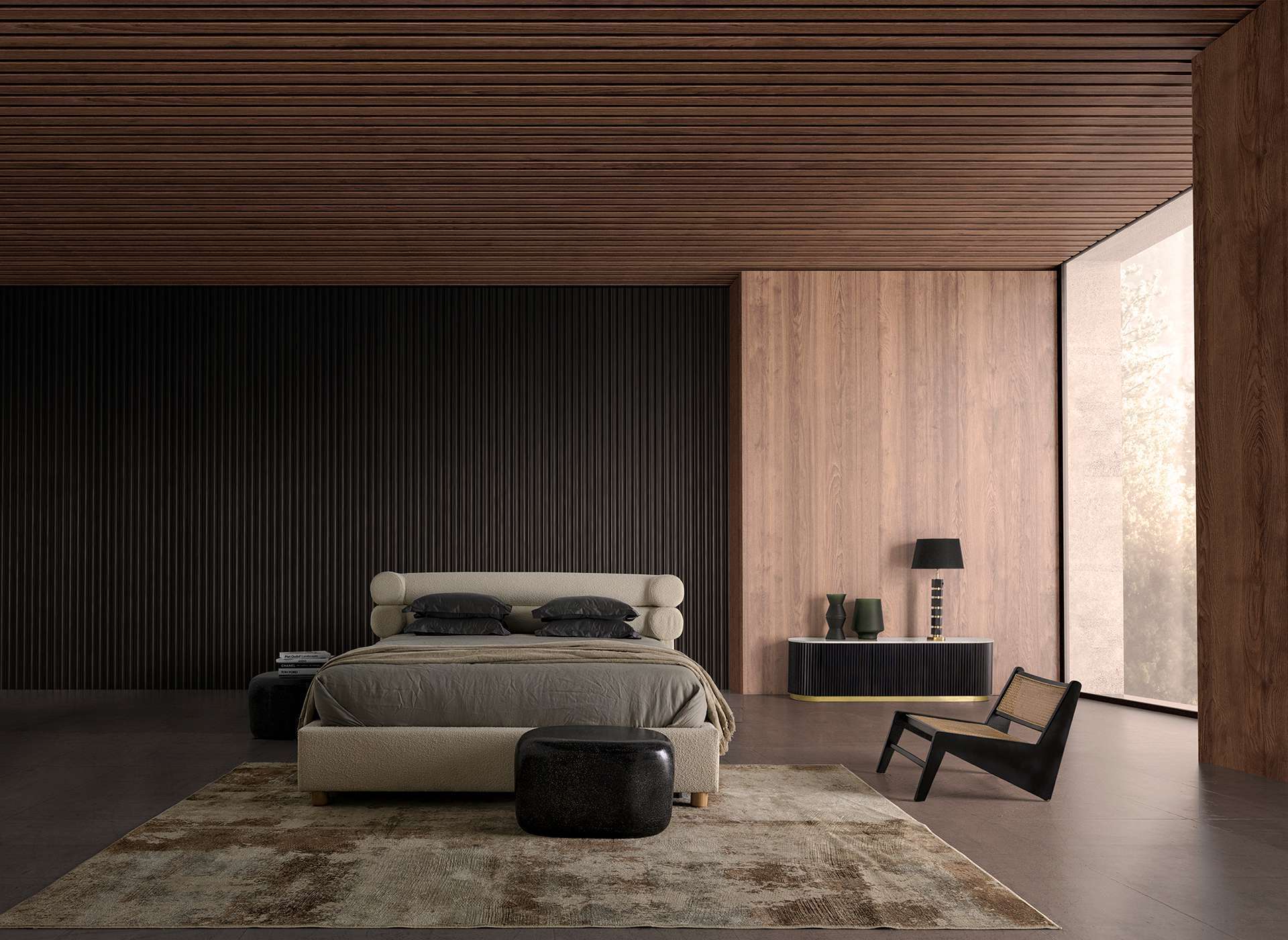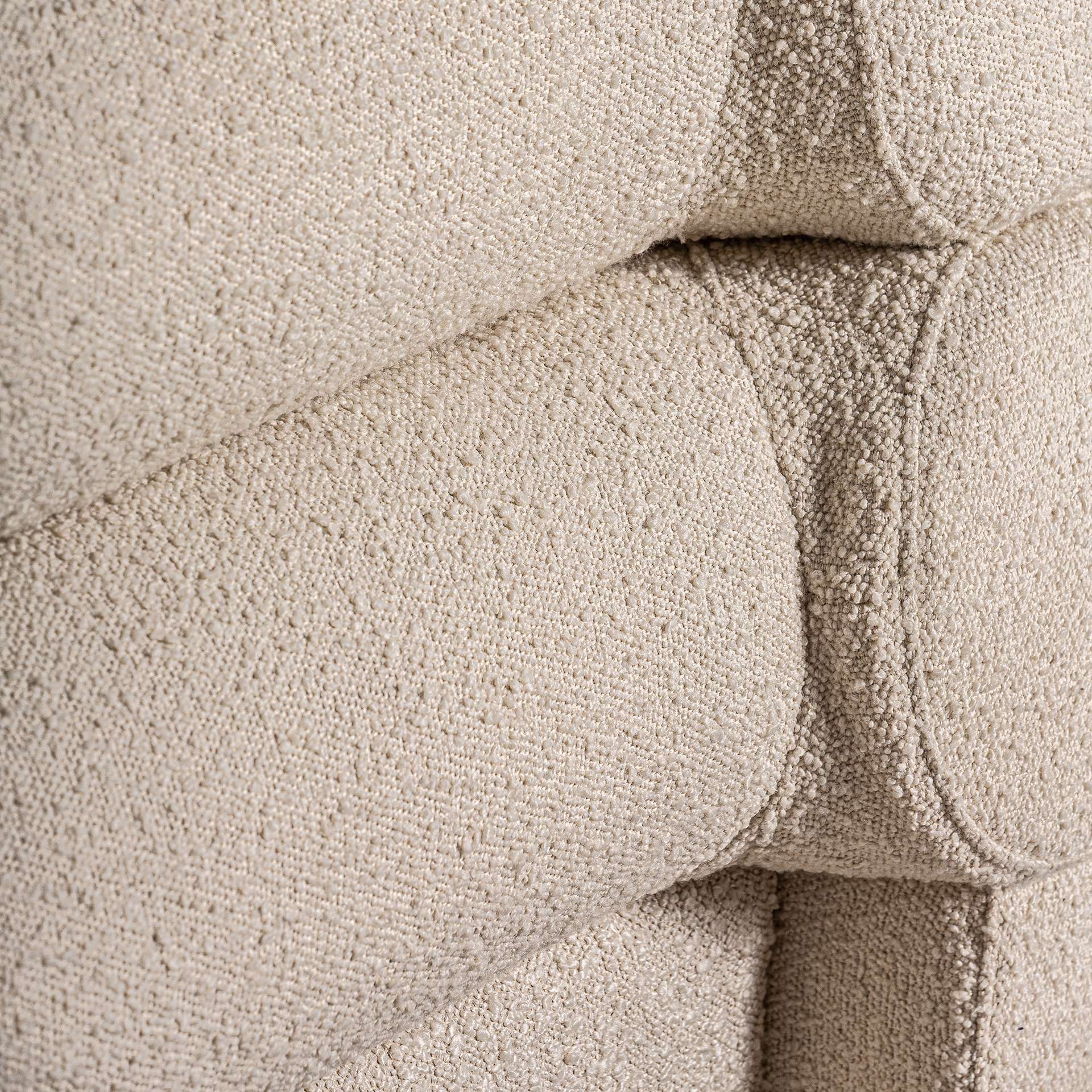 Cama de madera de pino y algodón bouclé, perteneciente a la familia de cabezales, color blanco roto, de estilo contemporáneo. Medidas: 212 largo x 230 ancho x 106 alto y peso 98,3 kg. Desmontable.