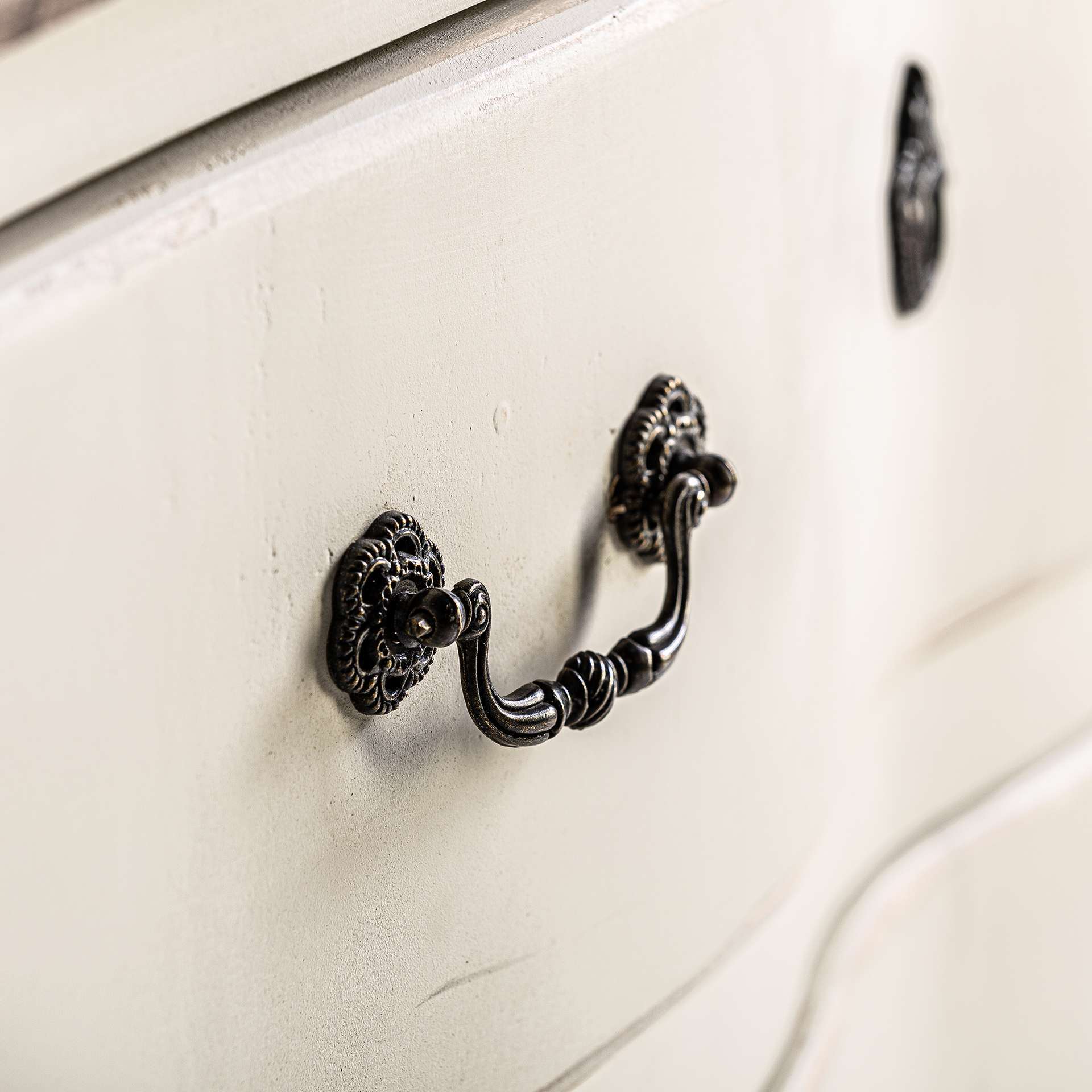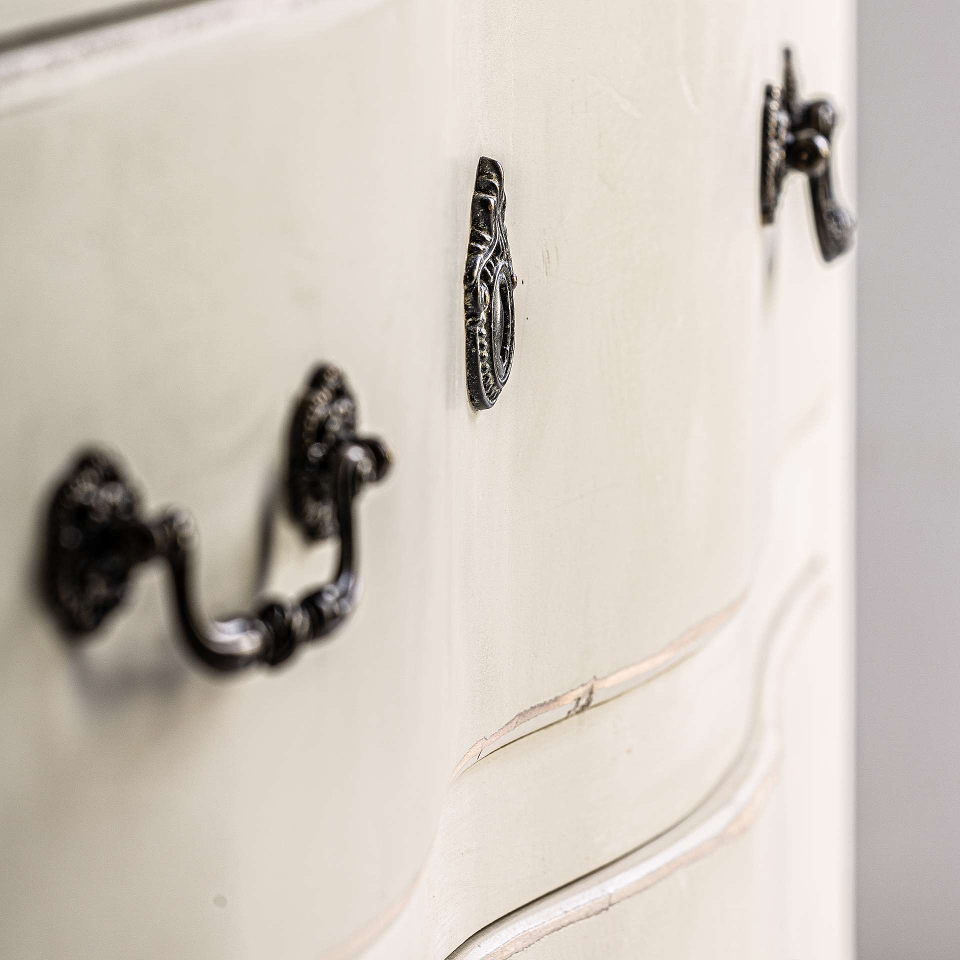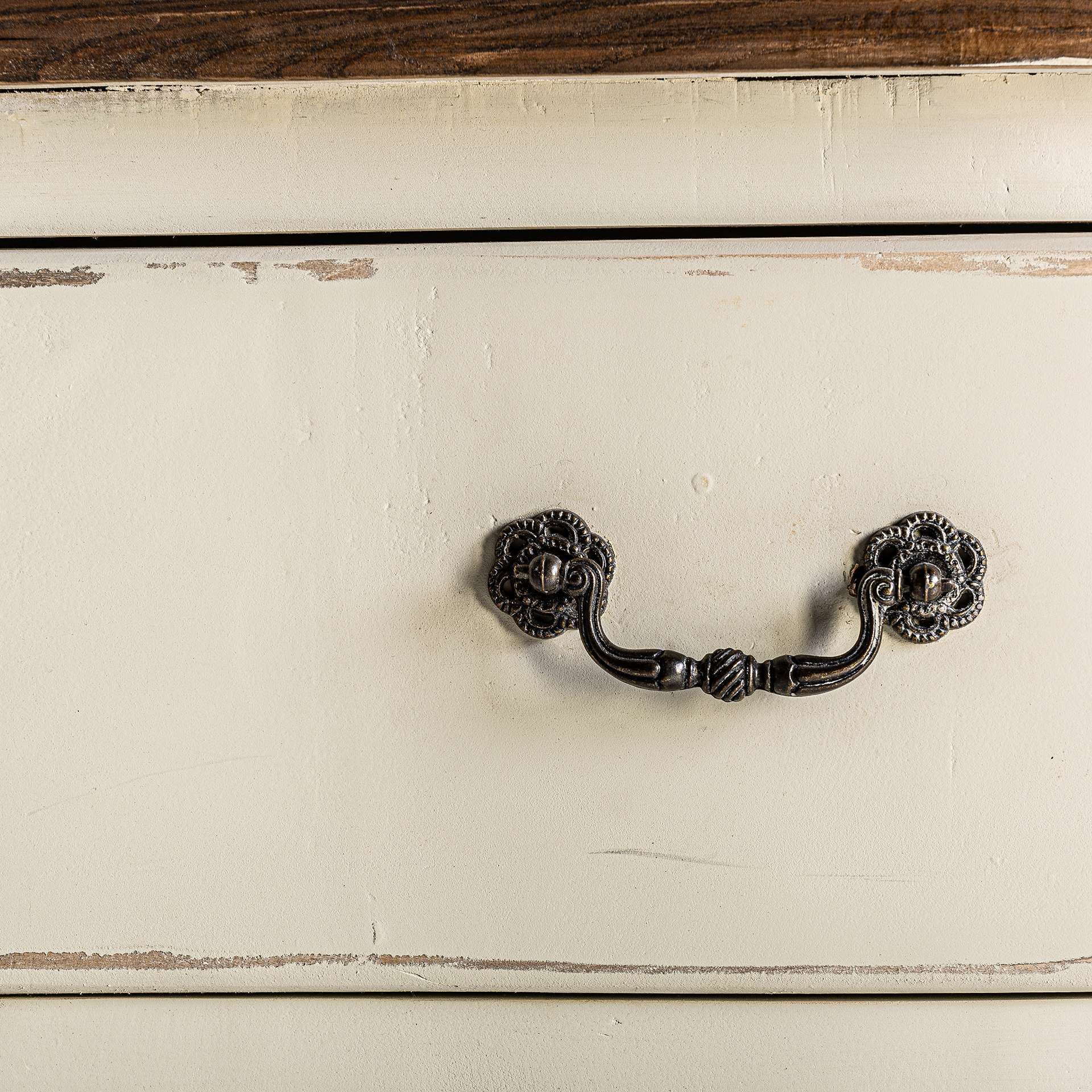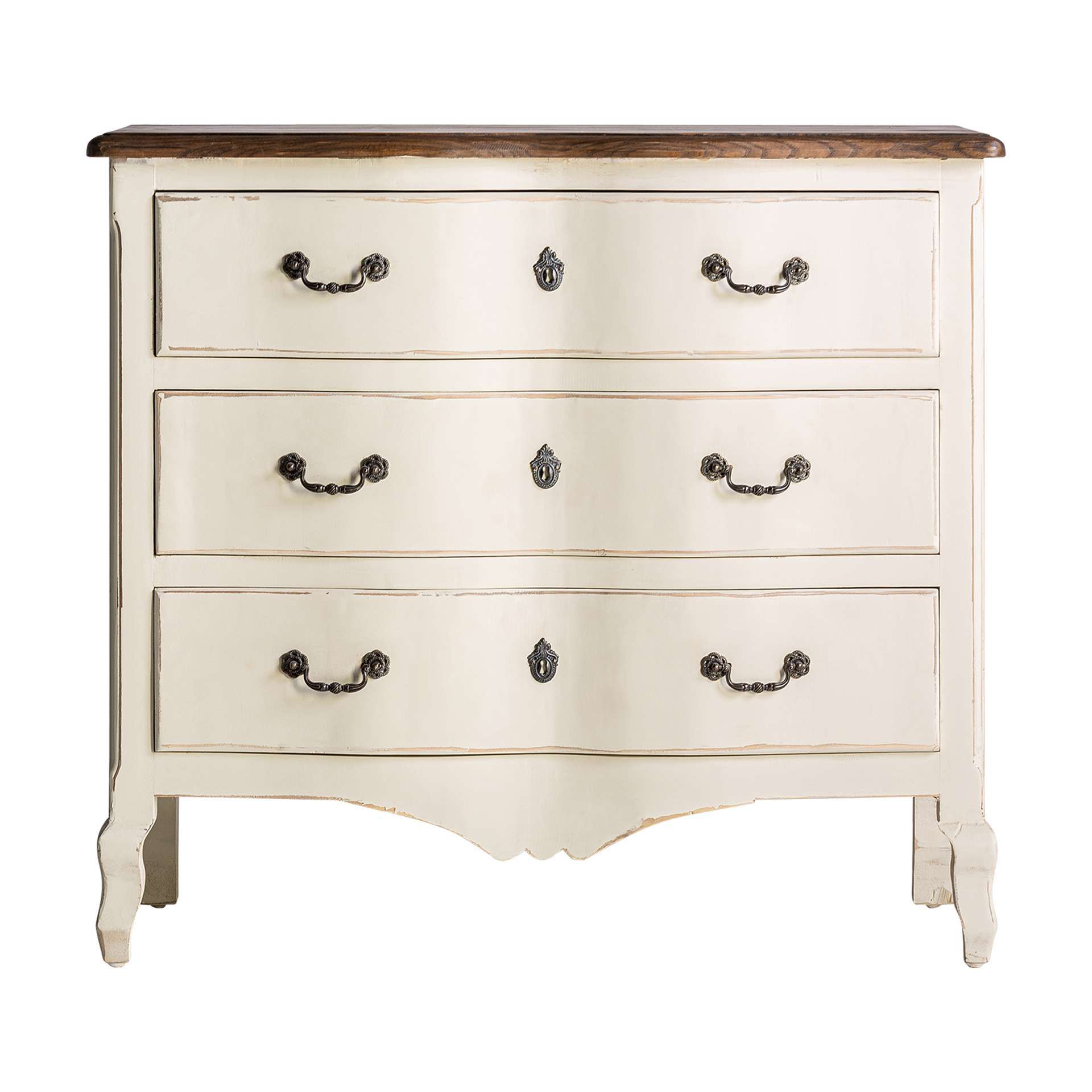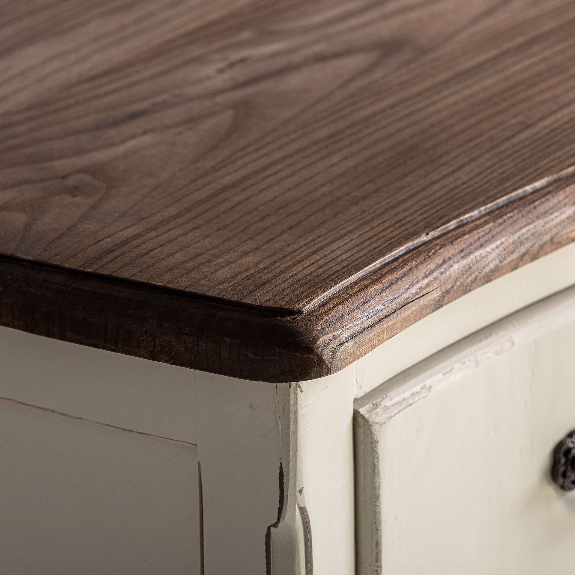 Cómoda de madera de olmo, perteneciente a la familia de cómodas, color blanco roto envejecido, de estilo provenzal. Medidas: 100 largo x 45 ancho x 90 alto y peso 31,7 kg.