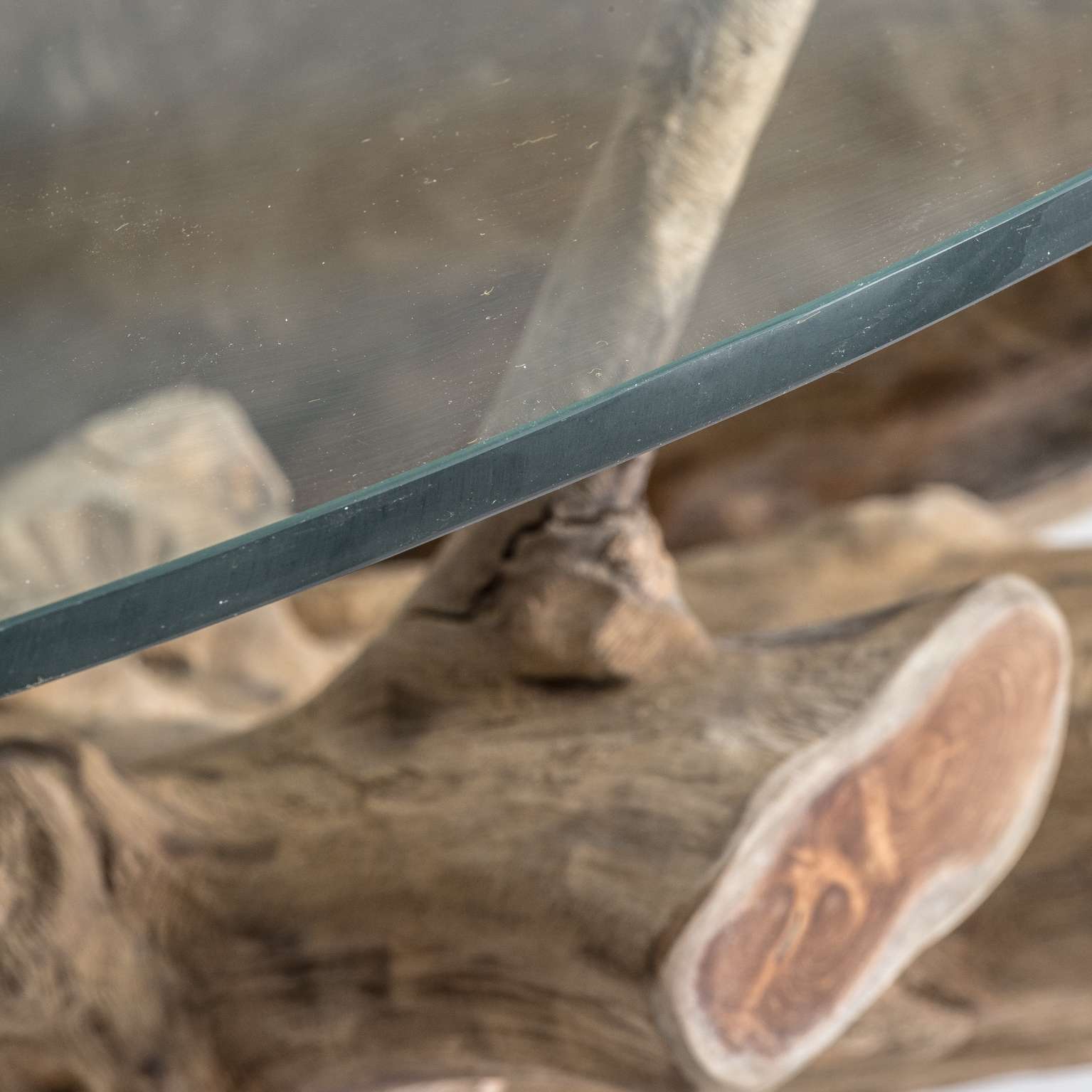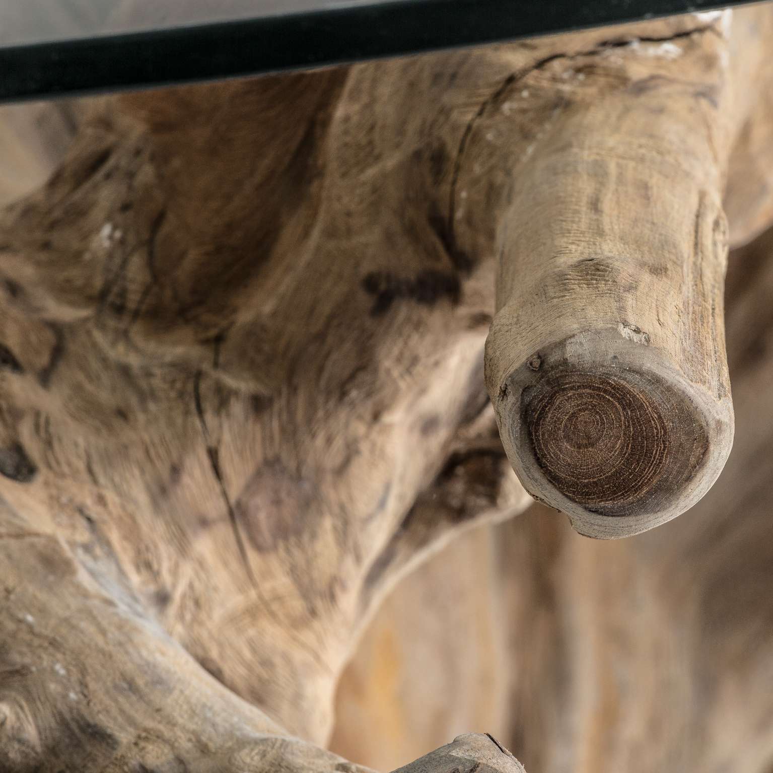 Mesa comedor de raíz teka y vidrio, perteneciente a la familia de mesas de comedor, color natural artesanal, de estilo étnico. Puede variar de color,forma y tamaño e incluye vidrio. Medidas: 150 largo x 150 ancho x 80 alto y peso 308 kg. Incluye cristal.