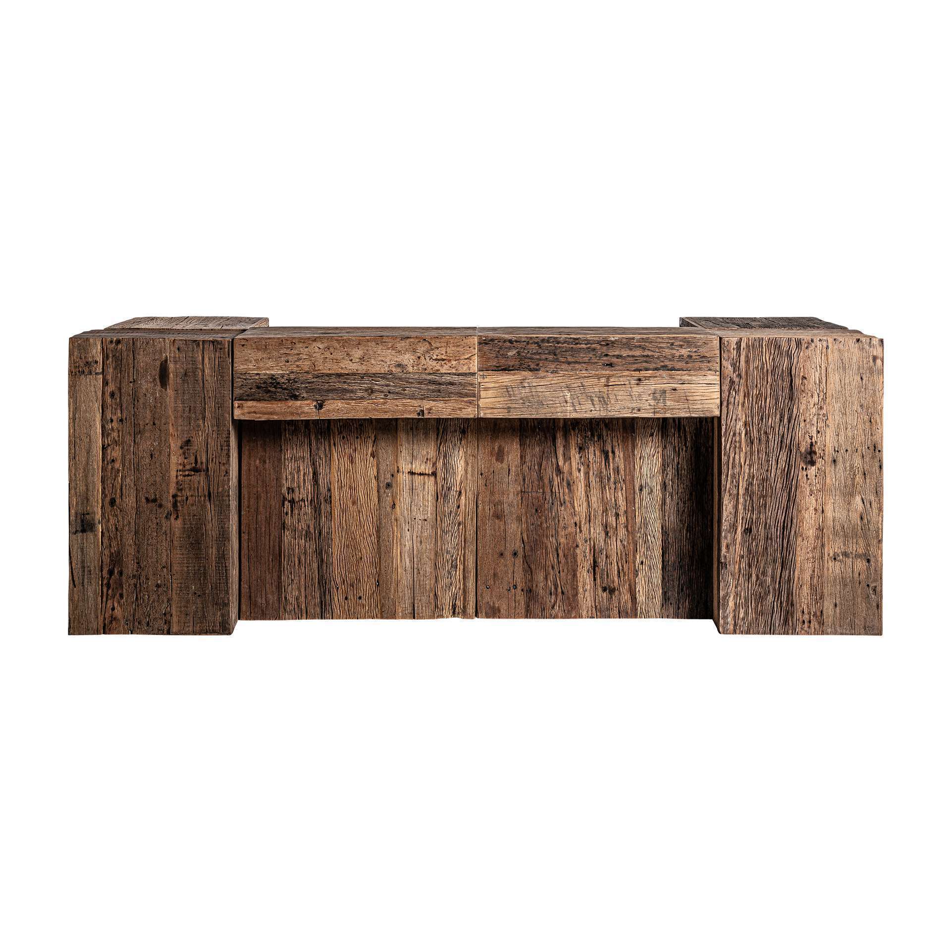 Módulo barra de bar de madera de mango reciclada, perteneciente a la familia de muebles bar, color marrón natural, de estilo étnico. Fabricación artesanal. Entendemos las variaciones de tonalidad, tamaño y forma o ciertas imperfecciones (grietas, nudos, marcas) como un valor añadido que la convierten en pieza única. Medidas: 60 largo x 60 ancho x 110 alto y peso 56,7 kg.