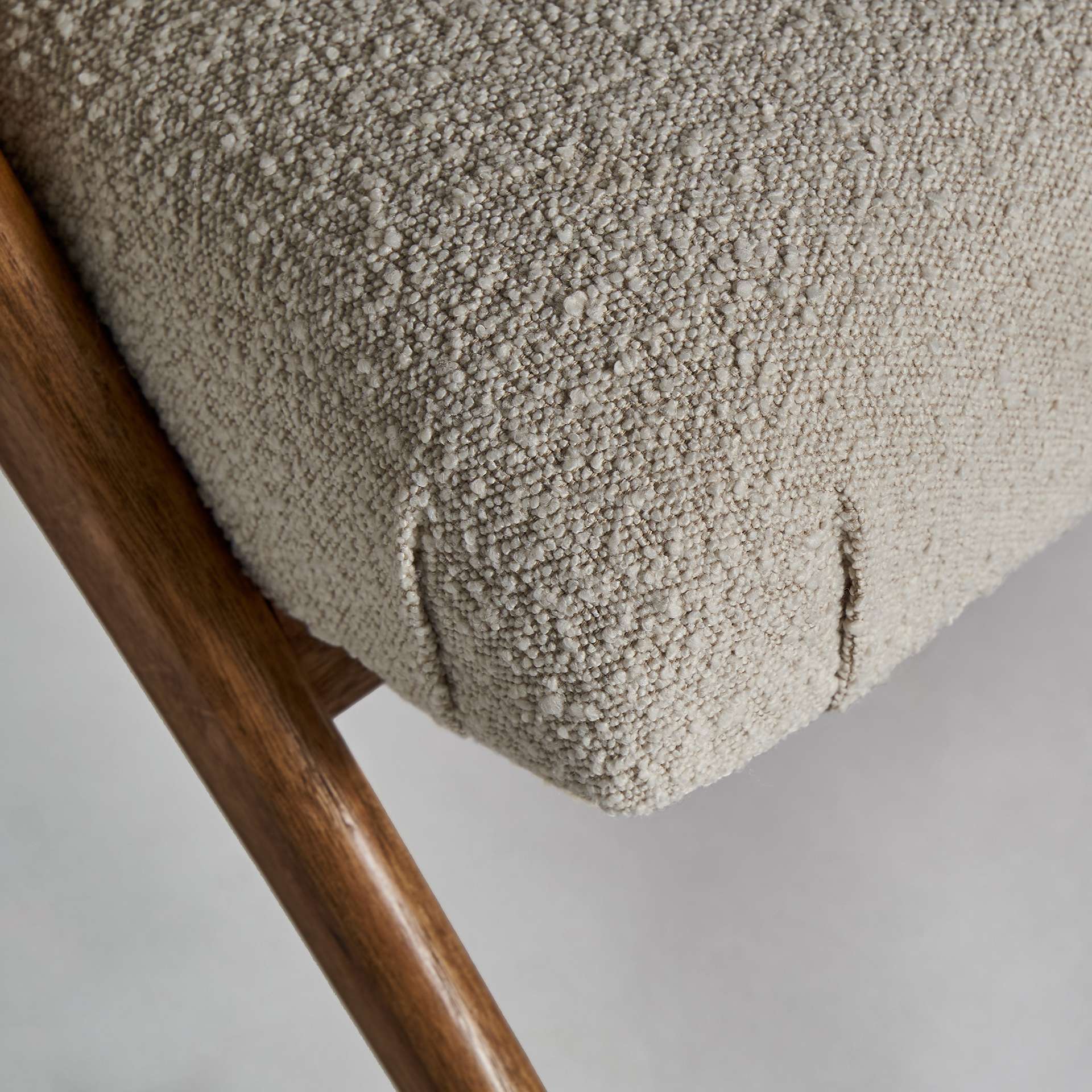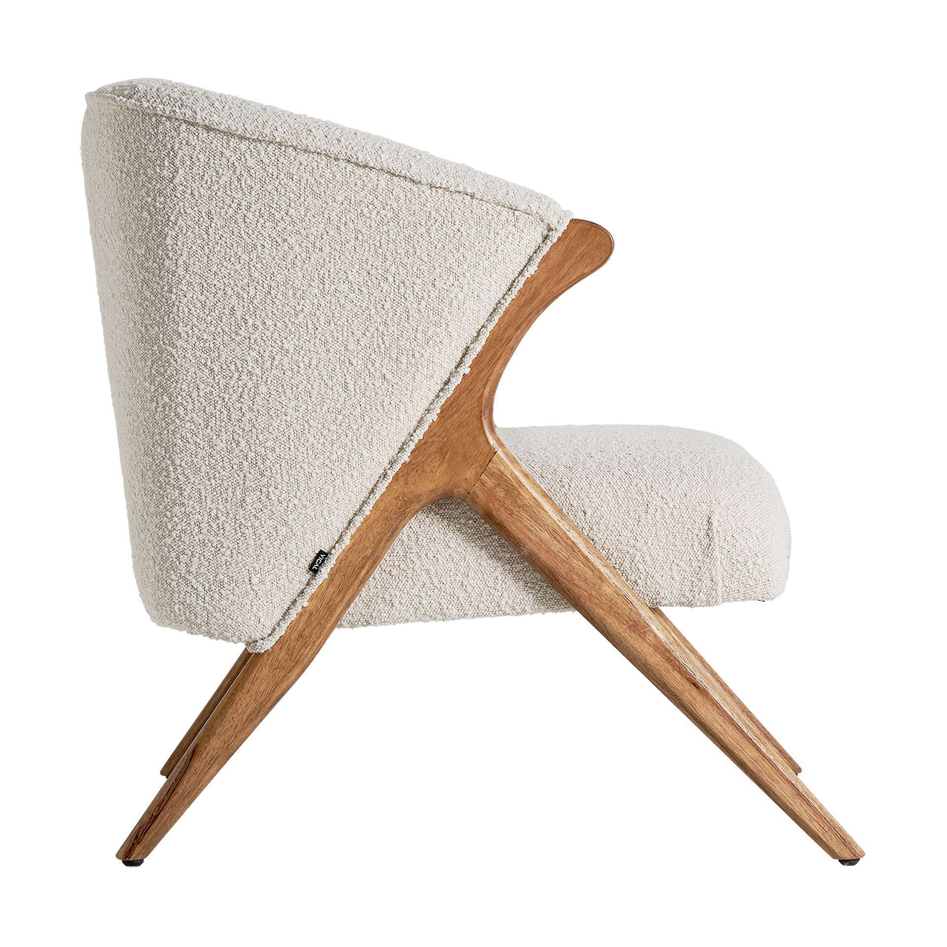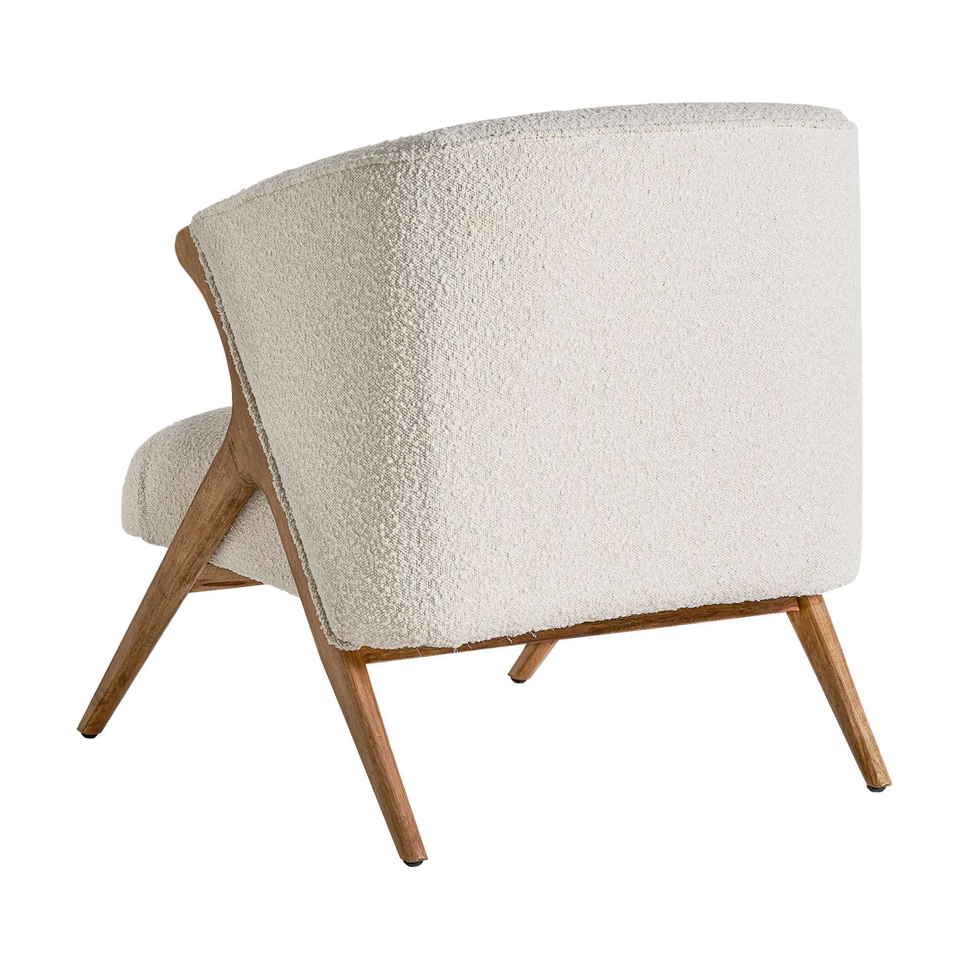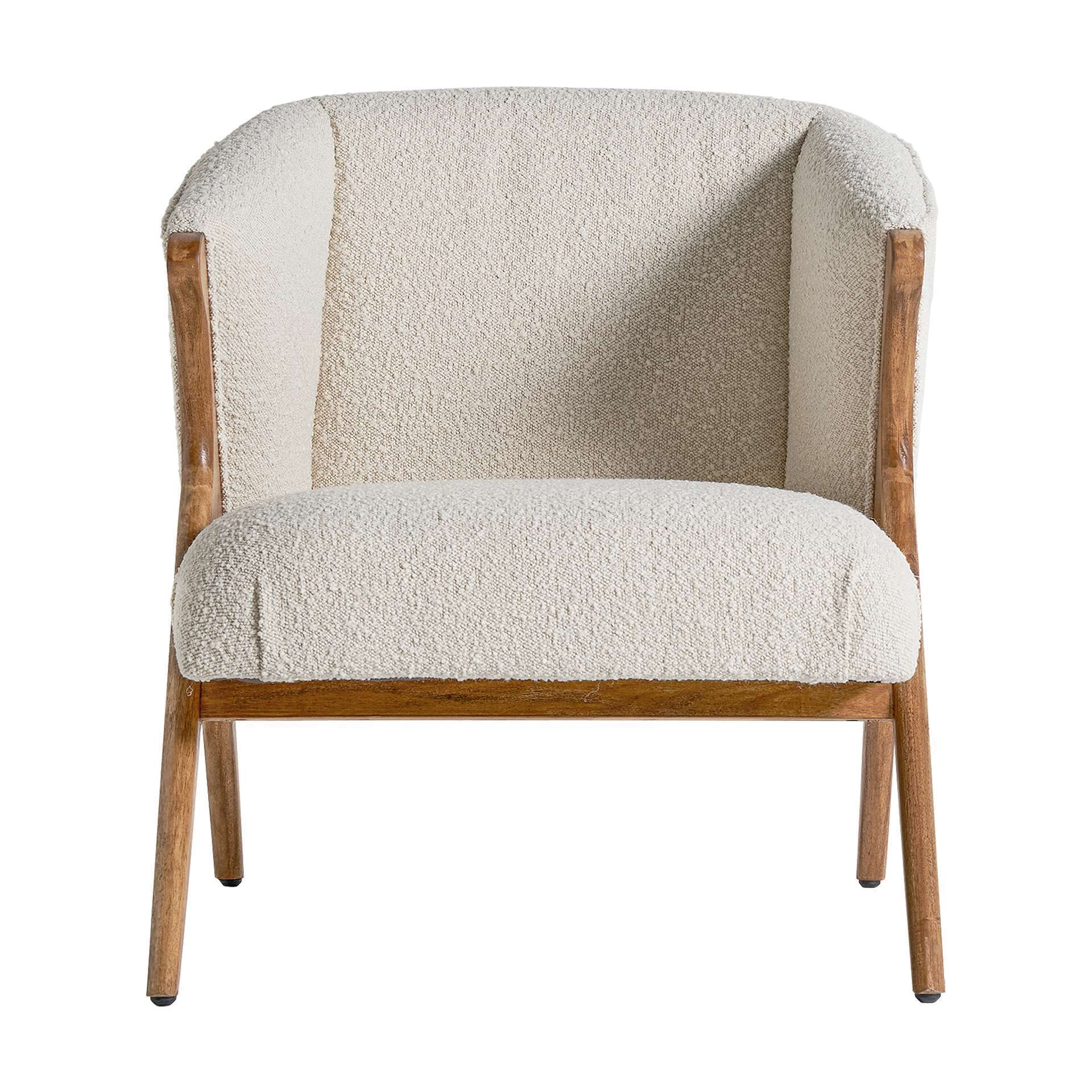 Sillón de madera de pino y algodón bouclé, perteneciente a la familia de sillones, color blanco/natural, de estilo colonial. Medidas: 72 largo x 80 ancho x 79 alto y peso 12,8 kg.