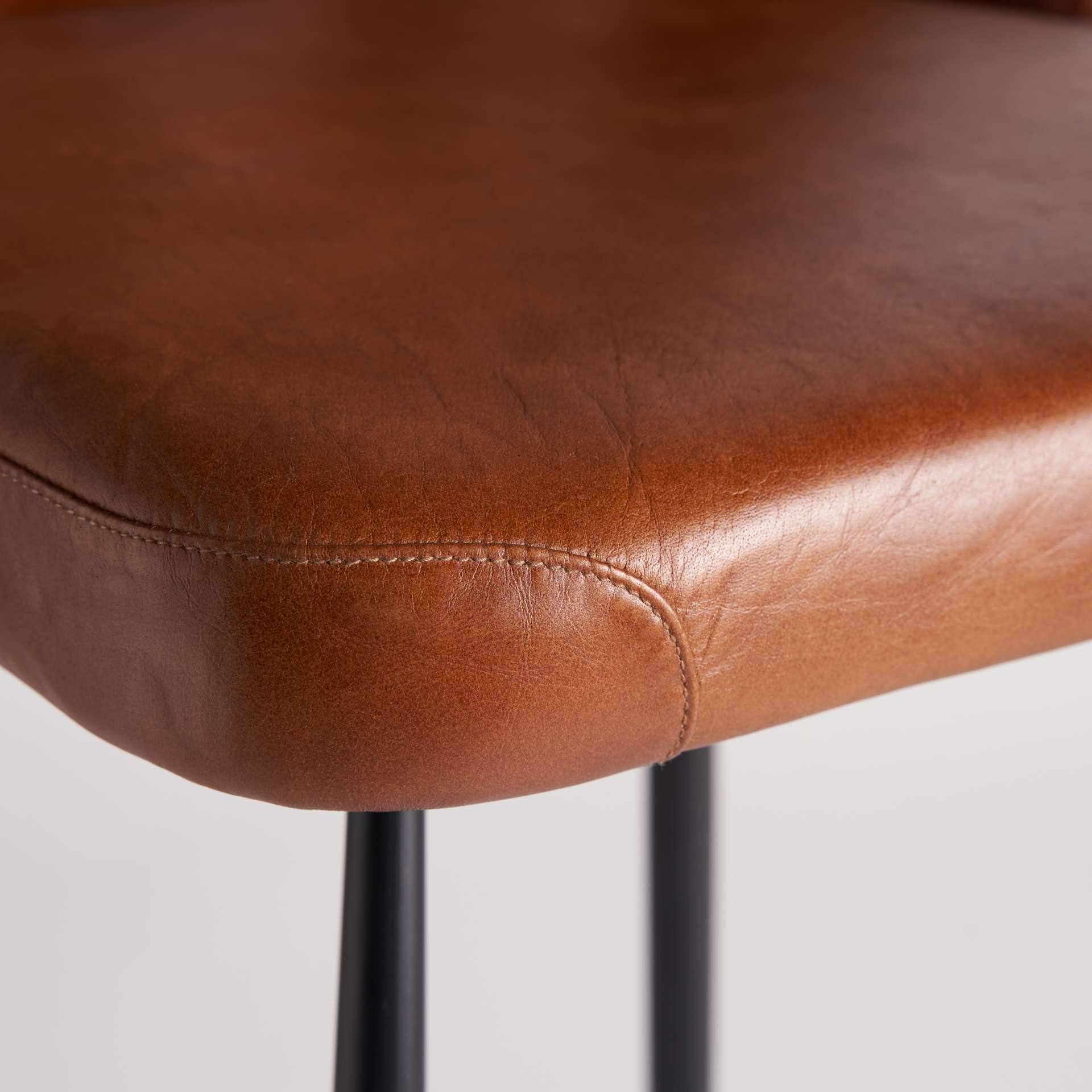Taburete de hierro, cuero y espuma, perteneciente a la familia de muebles bar, color marrón, de estilo vintage. Medidas: 46 largo x 48 ancho x 111 alto y peso 7,8 kg. Desmontable.