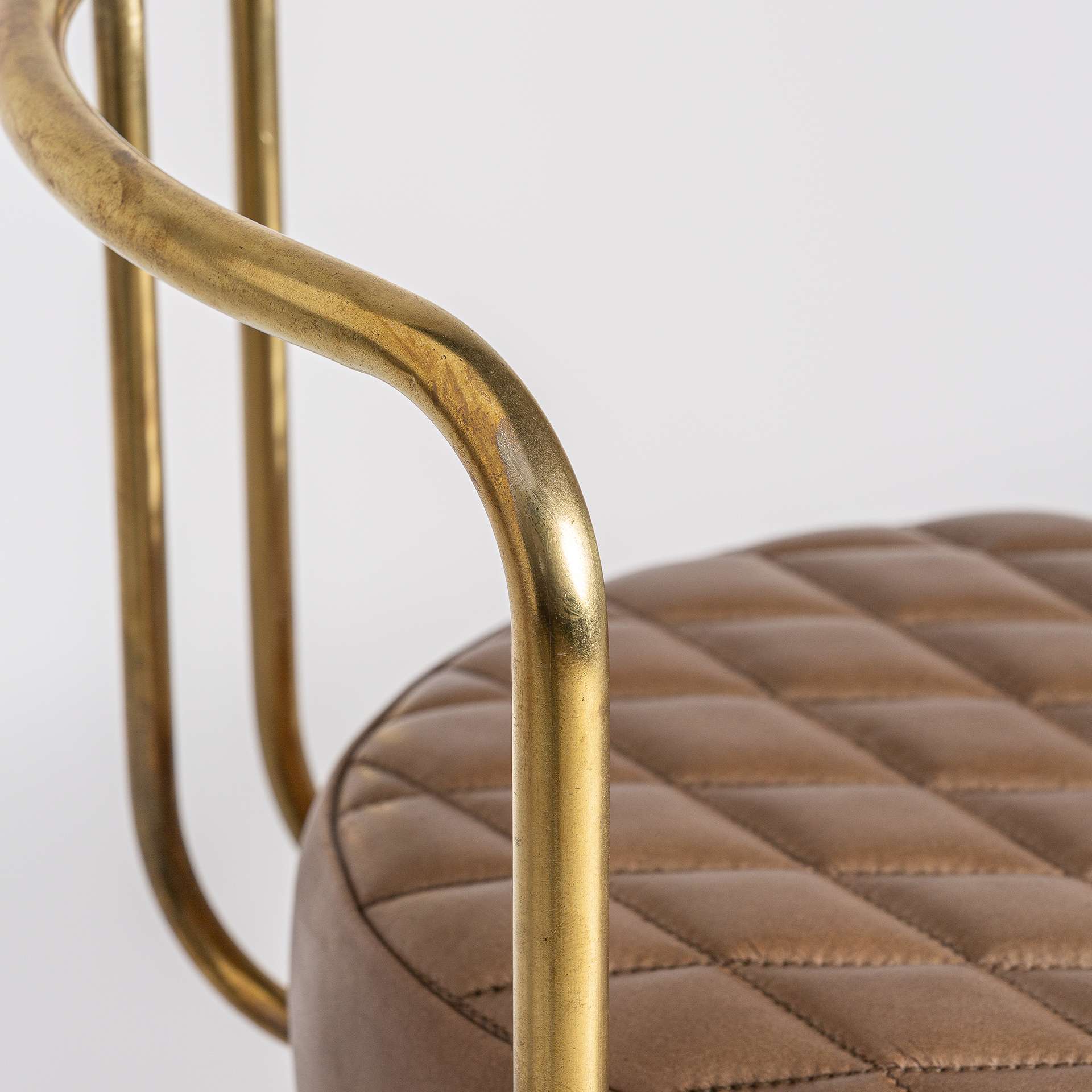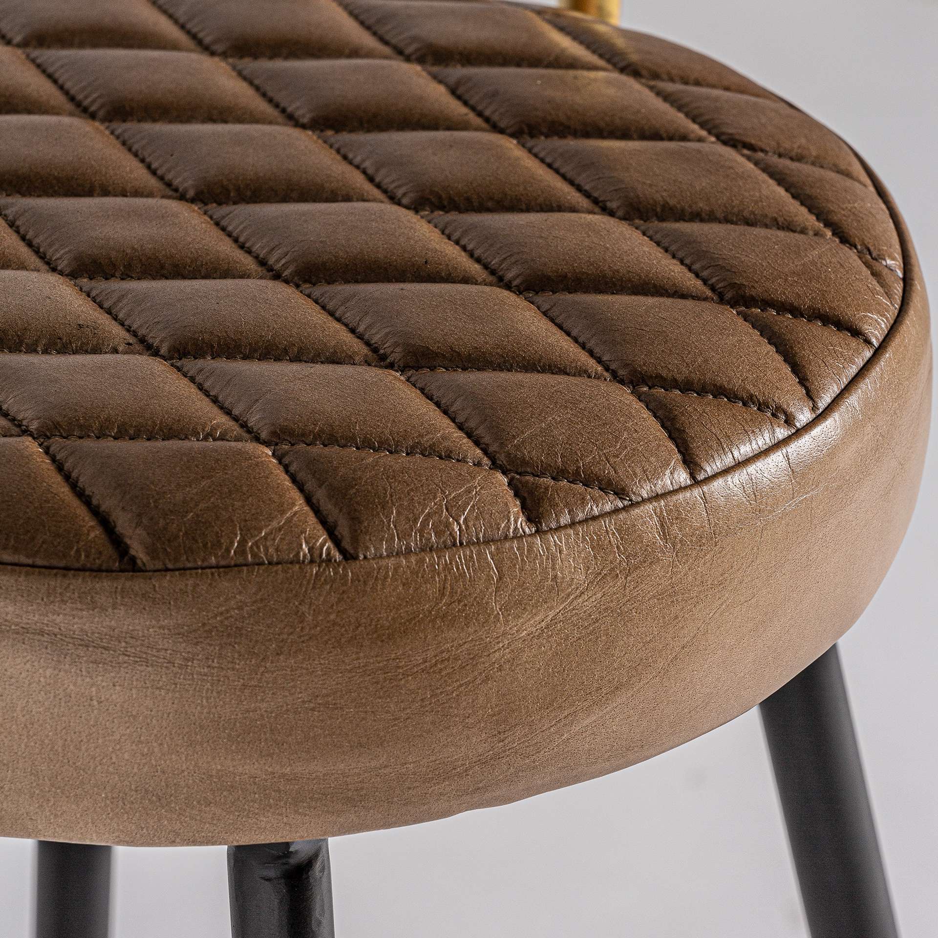 Taburete de hierro y piel, perteneciente a la familia de muebles bar, color marrón, de estilo vintage. Medidas: 50 largo x 50 ancho x 89 alto y peso 6,8 kg. Desmontable.