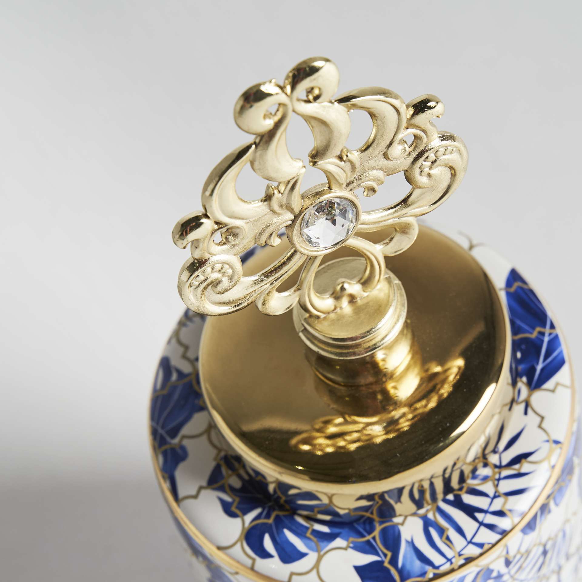 Tibor de cerámica, perteneciente a la familia de jarrones/centros, color azul/oro, de estilo art deco. Medidas: 15 largo x 15 ancho x 39 alto y peso 1,6 kg.